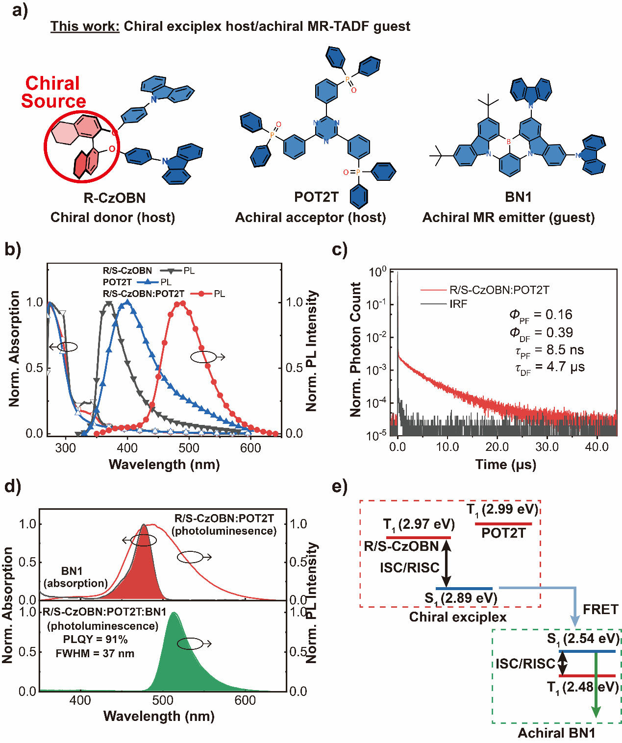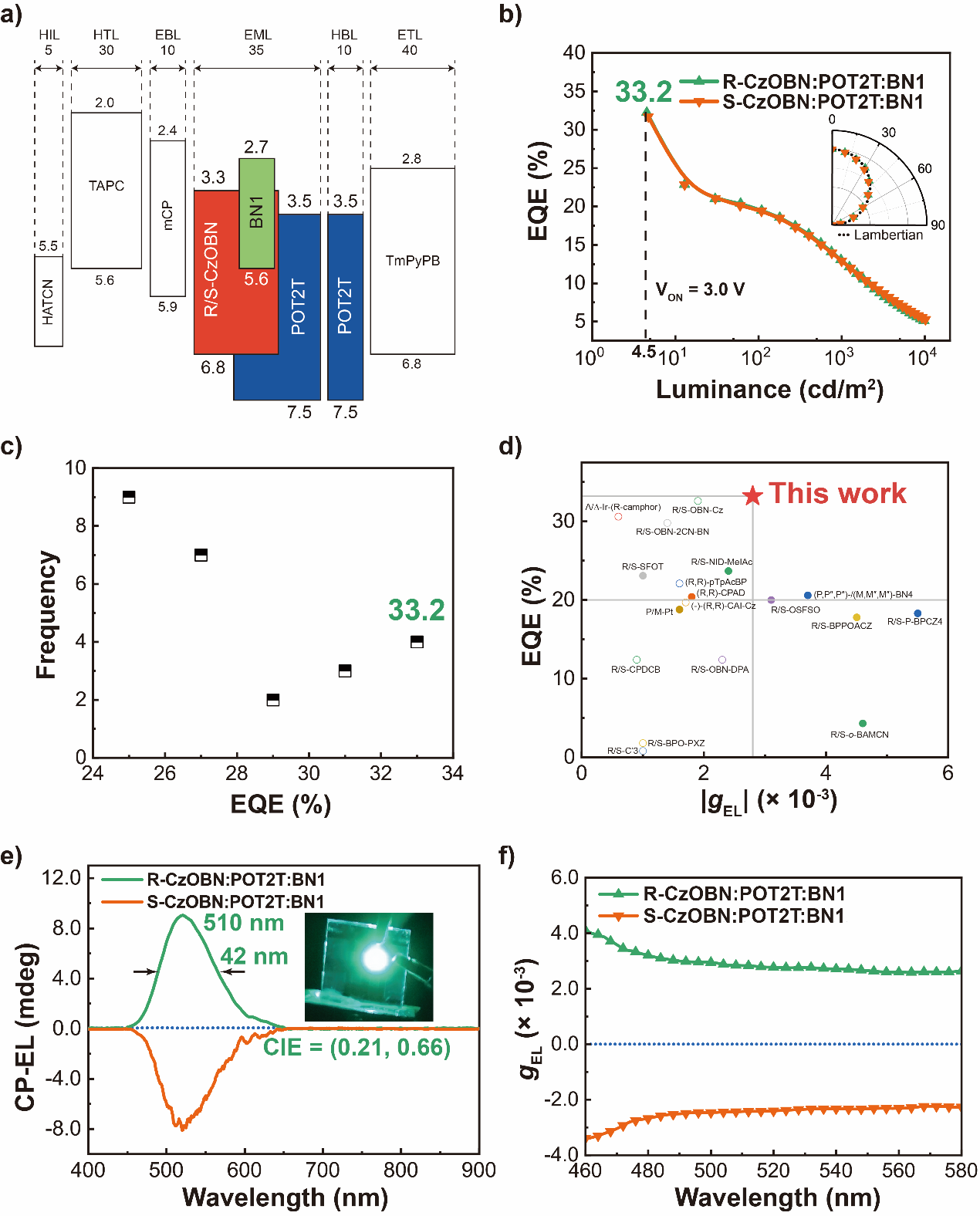 针对上述问题,武汉大学/深圳大学杨楚罗教授课题组提出了一种简单有效的策略,将手性给体和非手性受体分子进行搭配构筑手性激基复合物作为主体,非手性多重共振-热活化延迟荧光(MR-TADF)材料作为客体,实现了窄带发射的高效率圆偏振电致发光。作者利用氢化手性联萘酚和咔唑制备了具有高三线态能级(T1=2.97eV)的手性给体材料(R/S-CzOBN),该类材料具有稳定的手性,可以与另一具有高三线态(T1=2.99eV)的非手性受体材料(POT2T)搭配构筑手性激基复合物(图1);Förster能量转移(FRET)能够有效的发生在手性激基复合物主体和非手性的客体MR-TADF材料之间;采用传统掺杂工艺,制备了相应的蒸镀型CP-OLED器件,其电致发光的半峰宽(FWHM)为42nm,最大外量子效率EQE可达33.2%,电致发光不对称因子(gEL)为2.8×10-3(图2)。该工作通过手性激基复合物主体诱导非手性的客体产生了圆偏振电致发光,为实现高效率和高不对称因子的圆偏振电致发光提供了一种简单通用的方法,预期将对CP-OLED器件的发展起到很好的推动作用。