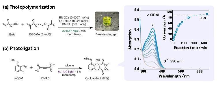 作者以BN-2Cz/1,4-DTNA组合为例,对上转换在光化学合成中的应用进行了研究(图3)。得益于优异的化学稳定性,该体系成功应用于绿光诱导的高效自由基聚合反应。同时,作者还证明了上转换紫外光作为外置光源引发Diels-Alder反应的可行性,在光照600 min后,反应效率高达96%。