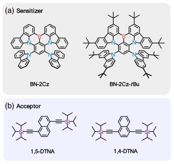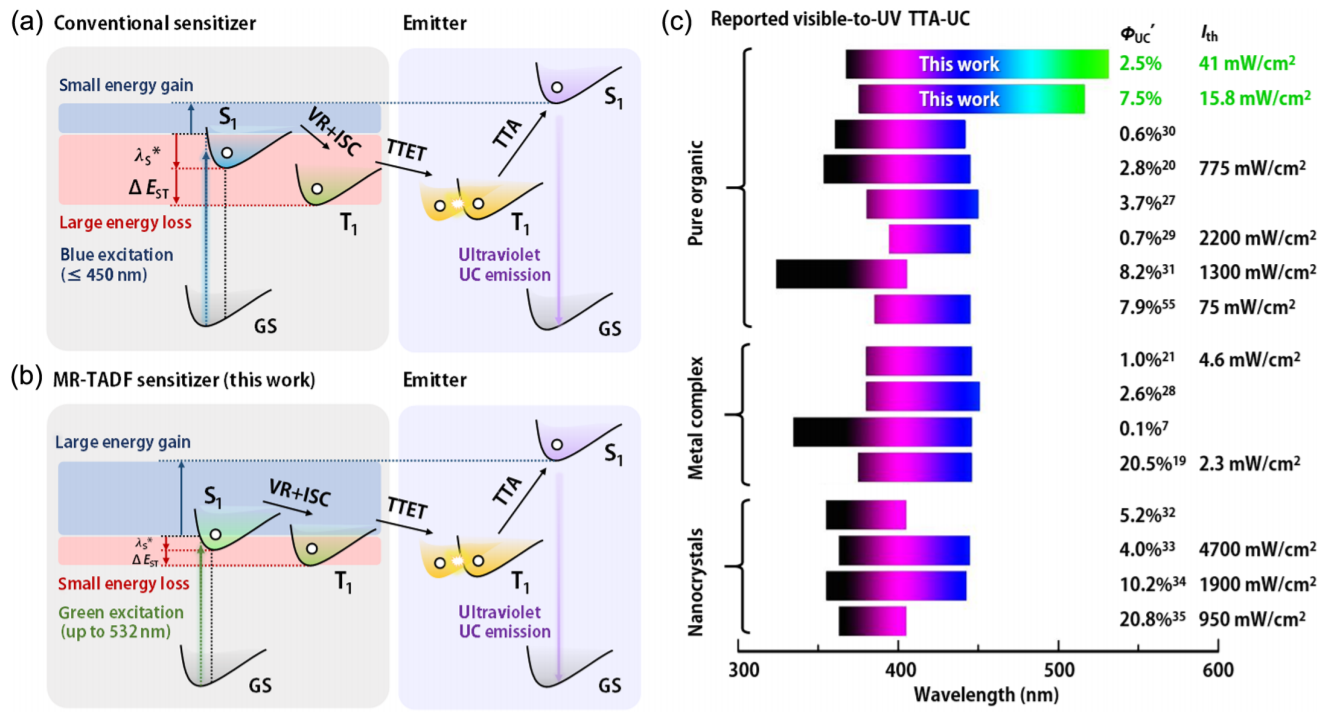 在此背景下,深圳大学材料学院杨楚罗特聘教授团队将多重共振热活化延迟荧光(MR-TADF)分子作为纯有机光敏剂(图2),利用其较小的振动弛豫和ISC能量损失,首次实现了绿光-紫外TTA上转换。通过对光敏剂和受体的三重态能级调控与匹配,最终获得了高达1.05 eV的反斯托克位移,是目前可见-紫外TTA上转换最高值。