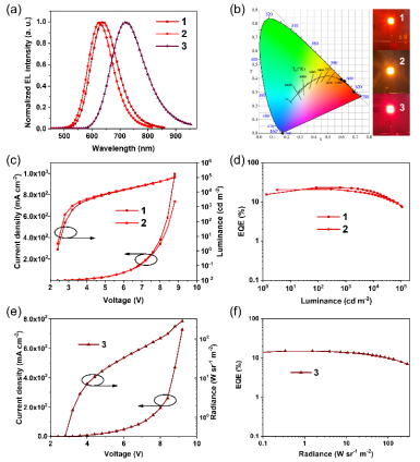 Figure 2.(a) Normalized EL spectra of the red and NIR devices. (b) CIEx,ycoordinates and photographs of the operating devices at 1000 cd m-2. (c) J-L-V characteristics and (d) EQEs versus the luminance of the red OLEDs doped with1(12 wt.%) or2(9 wt.%). (e) J-R-V characteristics and (f) EQEs versus the radiance of the NIR OLED doped with3(6 wt.%).