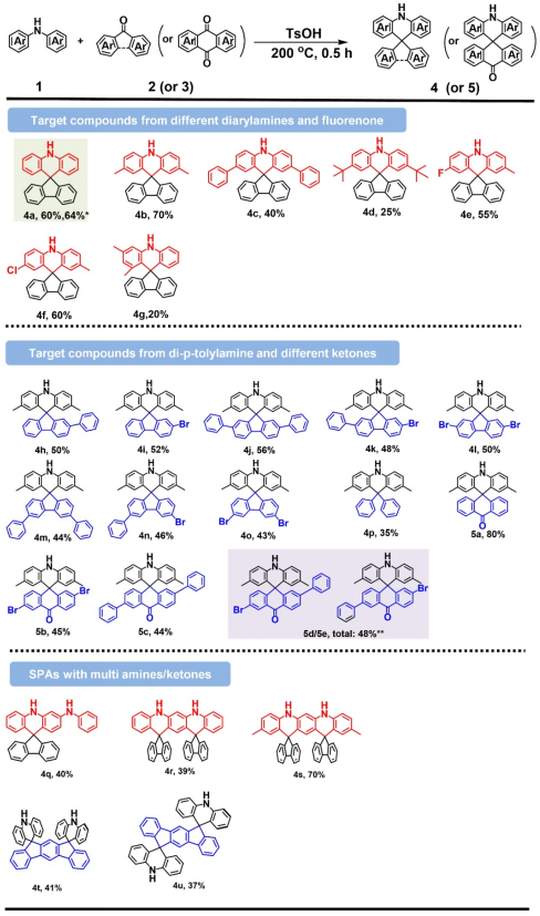 近日,深圳大学材料学院有机光电材料与器件团队特聘教授杨楚罗、助理教授刘贺报道了一种无溶剂、无金属催化剂一步环化合成9-螺吖啶及其衍生物的新方法。作者发现在酸催化下,经过30min高温加热,二苯胺可与芴酮一步环化,合成10氢-螺[吖啶-9’,9’-芴](4a),产率达到60%。作者分别对底物芳胺与酮的结构进行了探索,发现该反应对甲基,叔丁基,苯基,氟,氯,溴等取代基团有良好的相容性;将芴酮替换为二苯甲酮与蒽醌的衍生物,均可实现9-螺吖啶的制备。作者进一步探索了多胺与多酮底物,实现了含多螺结构的吖啶衍生物的制备。通过控制底物比例,二胺底物可与芴酮形成单环化(4q)或双环化的产物(4r),展现了该反应良好的可控性。对产物4a与4s尝试了扩量制备,4a在15mmol量级下实现64%的产率,而4s在20mmol下产率达到70%。该反应利用简单的底物合成9-螺吖啶衍生物,不仅降低了成本,同时也极大的拓展了9-螺吖啶衍生物的结构;其较好基团耐受能力进一步增加了9-螺吖啶基团功能化的多样性;同时,良好的可控性与可大量制备使该反应具有很好的应用前景。