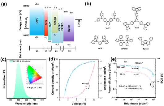图3.基于D2T-TR的电致发光器件的结构与性能