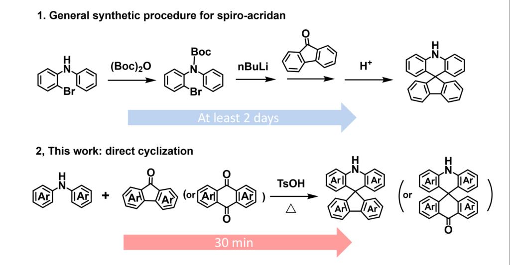 螺环芳烃因其独特的十字交叉结构,成为一类构筑有机半导体材料的重要结构基元,在光电,能源,生物等领域具有广阔的应用前景。9-螺吖啶及其衍生物作为一种结构简单、性能优秀的给体单元,近年来被广泛应用于高性能热活化延迟荧光(TADF)材料的制备。然而,目前常规合成9-螺吖啶基团的方法有许多不足:1)步骤繁多,耗时耗力;2)易燃试剂的使用增加了该基团大量合成的难度;3)2-溴二芳胺底物的拓展相对困难;这些因素极大地限制了9-螺吖啶衍生物的拓展和应用。如何简便的合成9-螺吖啶及其衍生物,是进一步拓展其结构、开发其功能、探索其应用的关键。