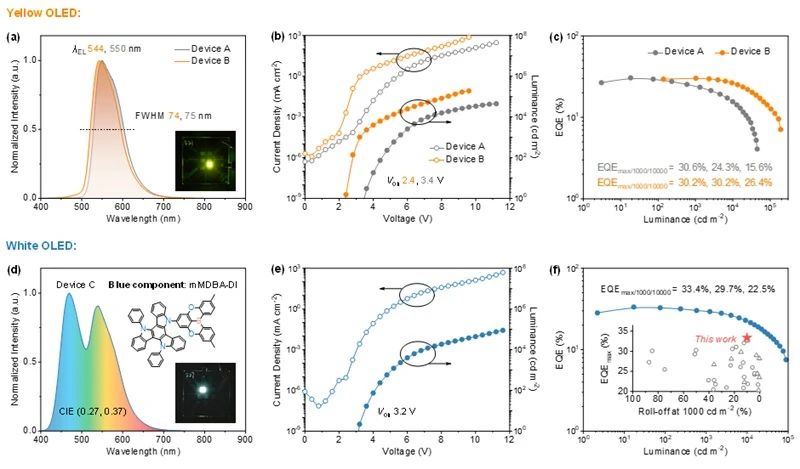 图3: 基于C-DABNA-MF的单色黄光与双色白光器件性能