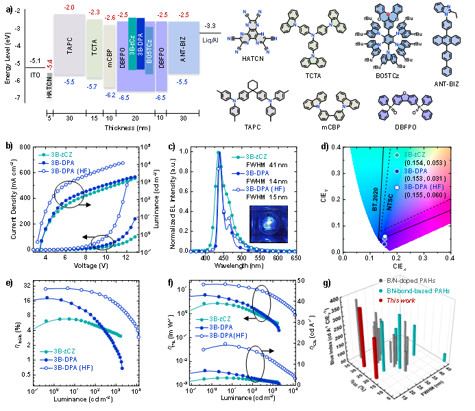 针对上述问题,深圳大学杨楚罗教授团队提出了一种利用简单高效的三重B-N共价键构筑窄谱带深蓝光MR-TADF材料的设计策略。首先,其分子设计具有创新性,不同于高阶1,4-BN掺杂的MR-TADF的复杂合成步骤以及大的材料分子量导致的较差器件蒸镀稳定性,基于纯B-N共价键的1,2-BN掺杂MR-TADF具有适中的分子量,能够通过无锂、胺基定位的硼化策略以接近定量合成的方式实现克级制备合成;其次,其具有优良的光物理性能,得益于1,2-BN浅LUMO能级和给体单元对位硼原子的吸电子特性,实现了极深蓝光发射;通过构筑具有MR-TADF特性的ADBNA中心单元,实现了超窄光谱发射(FWHM=13 nm),高荧光量子产率(PLQY= 98%)和高水平偶极取向(Θ > 98%)。以及通过给体片段扭曲结构增强的自旋轨道耦合相互作用,使得材料的kRISC高达4.4 × 104 s-1,超越了此前基于B-N共价键的深蓝光TADF材料。与此同时,基于该材料体系的OLED器件不仅展现出15 nm的超窄FWHM和接近BT.2020标准的深蓝光发射,而且实现了接近30%的最大外量子效率和330 cd A-1 CIEy-1的蓝光指数。其性能可与基于传统高阶1,4-BN掺杂的深蓝色MR-TADF相媲美。