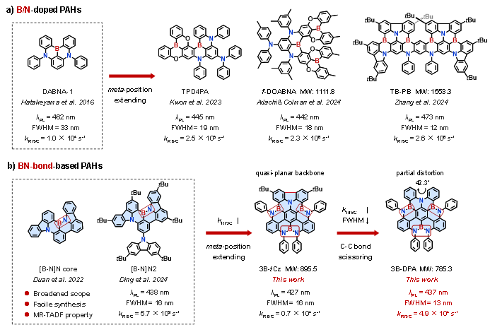 硼氮基多重共振热活化延迟荧光(MR-TADF)材料因其高色纯度和高发光效率,从众多发光材料中脱颖而出,已成为下一代广色域发光材料的有力候选。相较于传统的1,4-BN MR-TADF发光分子,基于B-N共价键的1,2-BN掺杂MR-TADF发光分子具有更简洁的合成路径和更浅的LUMO能级,因而成为深蓝光OLED的理想候选材料。然而,由于有限的反向系间窜越速率(kRISC约为103 s-1),严重制约了其器件效率。因此,开发兼具高效率与高色纯度的B-N共价键MR-TADF蓝光材料仍是一项极具挑战性的任务。