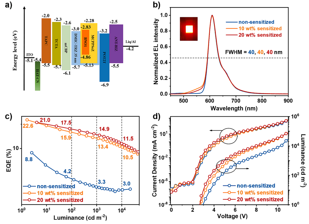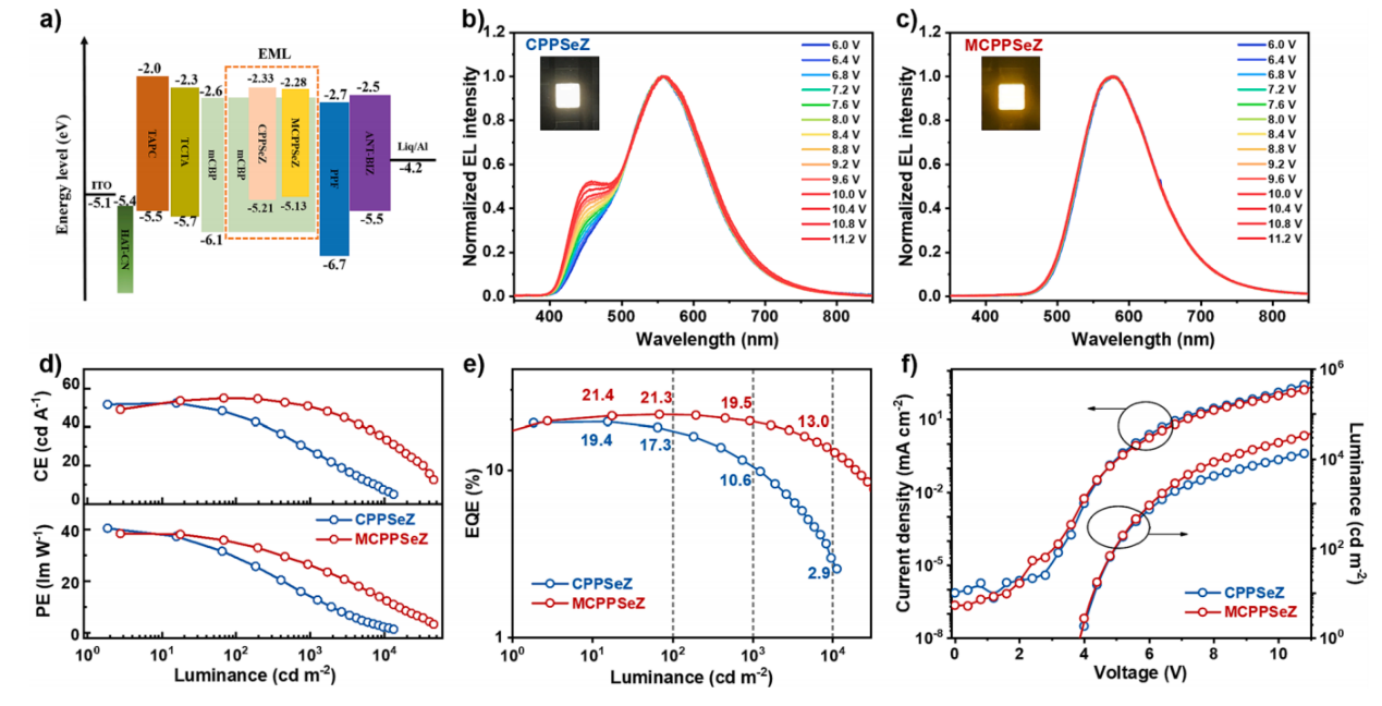 本研究提出了一种创新方法,通过利用重原子效应来加速多共振TADF分子的反向隙间窜越速率(kRISC)。研究团队通过在PSeZ与3,5-二氰基吡啶构成的D-A体系中引入甲基调节构型,成功开发出一种新型TADF发光分子 MCPPSeZ,并取得以下突破性成果。实验结果表明,设计的分子展现出了极小的ΔEST、快速的kRISC(4.2×106 s-1)以及同类型分子较高的PLQY。基于这些卓越的光物理性质,相应的OLED器件实现了21.4%的最大外量子效率(EQE),并且在高达10,000 cd m-2的亮度下保持了13%的EQE,显示出前所未有的低效率滚降。同时作为敏化剂用于红色多共振发射体 BNO1 的超荧光器件,首次实现EQE高达22.6%,并且极大抑制效率滚降,显色纯度与器件寿命亦显著提升。
