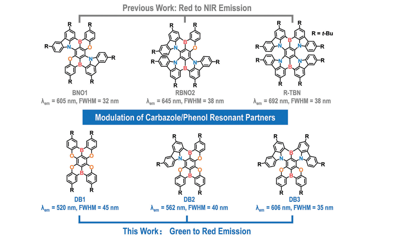 标题:Modulation of Carbazole/Phenol Resonant Partners within Diboron-Based Multi-Resonance Emitters Enable High-Performance Narrowband Green to Red OLEDs