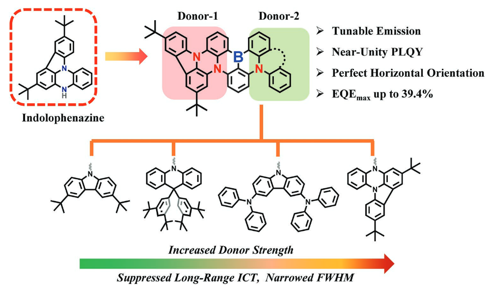 标题:An Effective Approach toward Yellow-to-Orange Multi-Resonance TADF Emitters by Integrating Strong Electron Donor into B/N-Based Polycyclic Architecture: High Performance OLEDs with Nearly 40% EQE