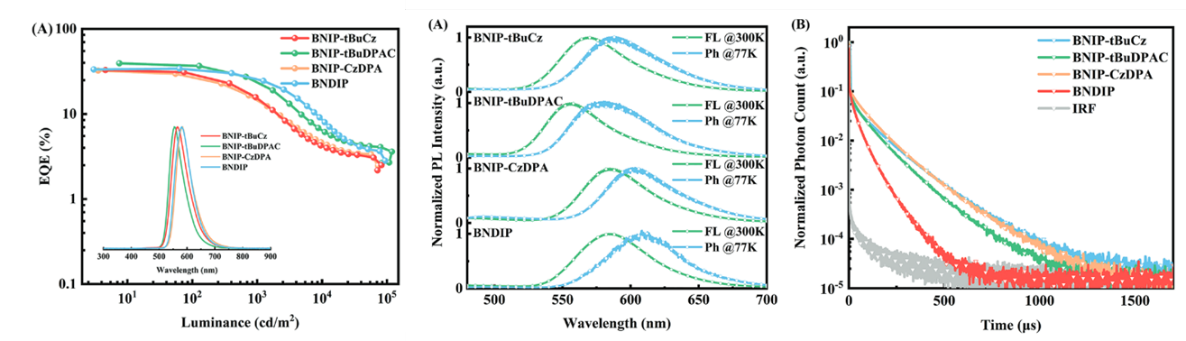 针对上述挑战,深圳大学杨楚罗教授团队提出了一种设计长波长MR-TADF分子的新策略,通过将强电子供体吲哚吩嗪(IPZ)整合至B/N多环骨架中。IPZ基团的引入可通过增强分子内电荷转移效应及扩展分子共轭体系,使发射光谱红移至长波长区域。此外,IPZ片段的刚性骨架具有分子刚性,从而维持其独特的窄谱带发射。基于此分子设计理念,通过引入第二电子供体单元,设计出一系列对称与非对称的吲哚吩嗪基MR-TADF分子。实验表明,基于单硼嵌入MR骨架的四种新型分子因IPZ强供电子特性,均呈现黄光至橙光发射,MR骨架中双供体单元的供电子能力差异对发射波长与半峰宽等具有显著调控作用。这些MR分子展现出接近100%的PLQY及近乎100%的水平偶极取向比率(Θ//)等优异特性。基于此类MR-TADF分子制备的黄光与橙光OLED器件,实现了高达39.4%的外量子效率(EQE)、163 lm W⁻¹的功率效率及接近120000 cd m⁻²的亮度,达到该领域的最先进水平。此外,器件在3000 cd m⁻²初始亮度下表现出超长操作稳定性(LT99超过110小时)。