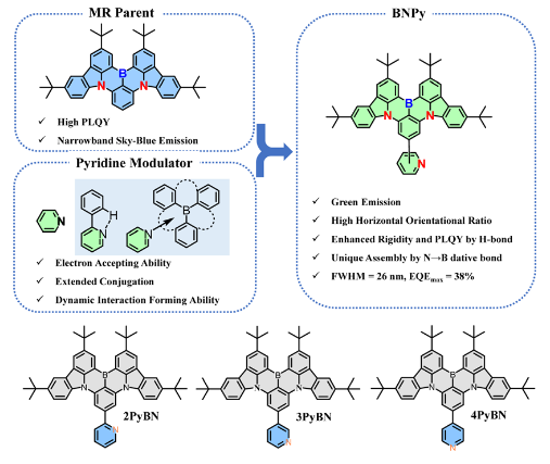 基于B/N多环芳香骨架的多重共振(MR)分子因其卓越的光物理性质,已成为有机发光二极管(OLED)领域的前沿材料。通过功能化修饰MR分子框架以优化其性能,已成为材料化学领域的新兴研究方向。BN基多重共振(MR)发射体的平面刚性分子骨架对实现高PLQY和窄谱带发射至关重要,然而,这种刚性平面结构也导致分子易发生π-π堆积。而动态键相互作用(如氢键、N/B配位键)可调控分子构象与超分子组装,但尚未应用于MR材料的设计中。