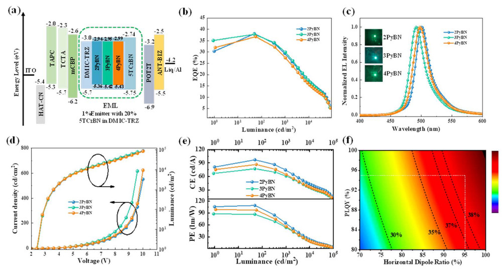 动态键相互作用作为调控材料性能的多功能工具,在本文中首次被引入MR骨架设计:深圳大学杨楚罗教授团队通过将具有氢键和N/B配位键等动态键形成能力的吡啶基团整合至MR分子中,成功开发出可高效合成的发光材料。该设计不仅保留了传统MR分子的特性,更赋予材料发射光谱可调谐性、窄谱带发射、提升光致发光量子产率(PLQY)以及固态下独特的超分子组装行为等优势。得益于氢键增强的分子刚性所带来的综合性能提升,基于该分子的绿光OLED器件展现出38%的外量子效率(EQE)、26 nm的半峰宽(FWHM)等优异性能,同时具备良好的效率滚降特性,这项工作提出的动态键调控策略,为多重共振材料的结构衍生及超分子功能化提供了新思路。