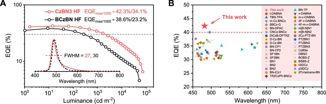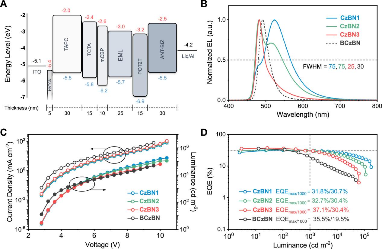 针对上述问题,深圳大学杨楚罗教授团队提出了一个有效的策略,通过正交连接电子给体单元与MR框架,引入具有自旋轨道耦合的多通道反向系间窜越过程。通过对激发态能级的精细操作,可以“无声”地诱导额外的段间电荷转移三联体状态,而不会扰动最低激发单体状态的MR特性。与原MR骨架相比,发光分子CzBN3不仅使kRISC增加了23倍,而且还实现了接近统一的光致发光量子产量和较窄的发射光谱。这些优点使最大外量子效率(EQEmax)达到37.1%,并抑制了无敏化器件(EQE1000 = 30.4%)的效率滚滚,并在高亮度器件中进一步提高(EQEmax/1000 = 42.3/34.1%)。