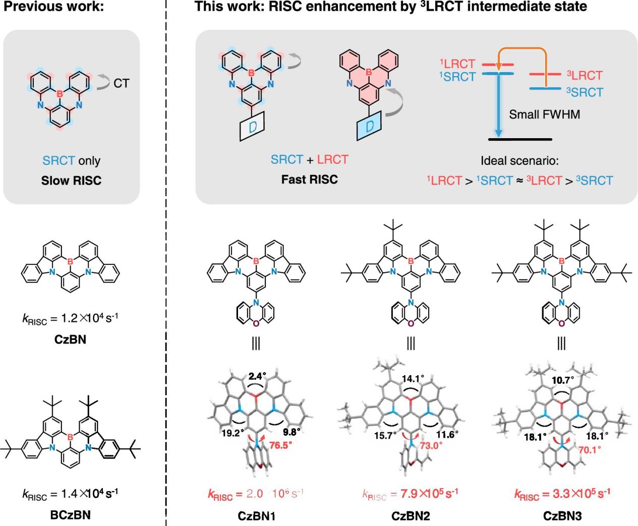 多重共振热活化延迟荧光材料(MR-TADF)是窄带有机发光二极管的有前途的候选者,但其电致发光性能通常受到缓慢的反向系间窜越速率(kRISC)的阻碍。