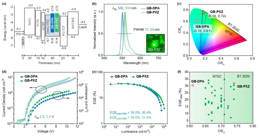在本研究中,深圳大学杨楚罗、缪景生、曹啸松团队提出了一种协同分子设计方法,结合 π 扩展和外围锁定来解决这些挑战。这种方法可以构建四重硼化 MR-TADF 发射器,不仅可以提供精确调谐的纯绿色发射,半峰全宽 (FWHM) 为 15 nm,而且还表现出接近 1 的量子产率、快速 RISC 和最佳水平偶极子取向。由此产生的无敏化剂 OLED 接近 BT.2020 标准,CIE 坐标为 (0.18, 0.74),并表现出令人印象深刻的外部量子效率 (EQE),最大为 36.6%,1000 cd m-2 时为 31.8%。此外,该设备表现出良好的操作稳定性,在初始亮度为 1000 cd m-2 时,使用寿命 (LT80) 为 485 小时。因此,这项研究提供了一种有前途的分子设计策略,可有效提高综合 OLED 性能。相关研究成果发表于《Angew. Chem. Int. Ed.》上。