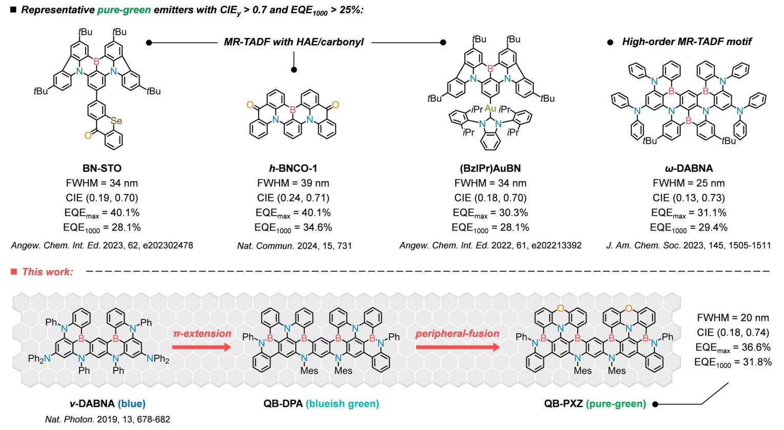 论文信息:Synergistic π-Extension and Peripheral-Locking of B/N-Based Multi-Resonance Framework Enables High-Performance Pure-Green Organic Light-Emitting Diodes