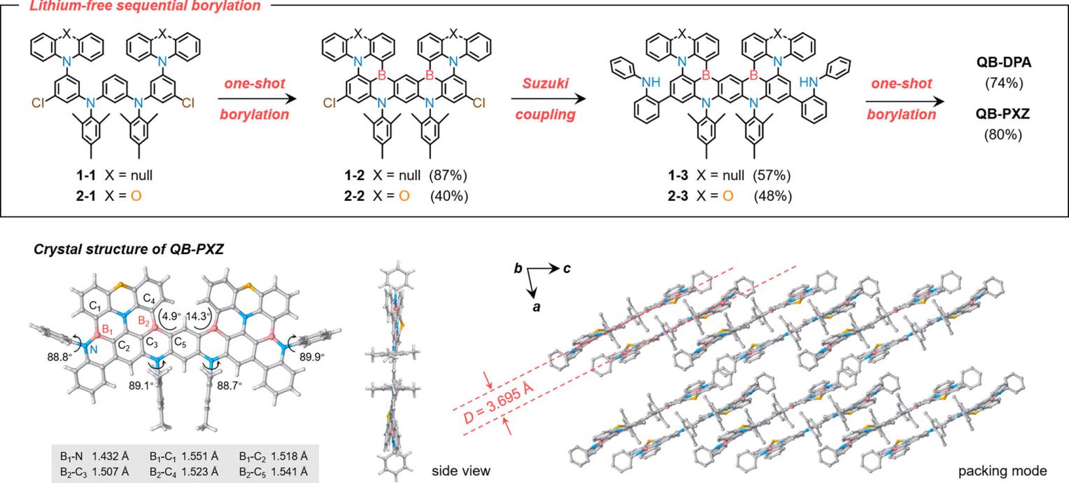 图 2:发光分子的合成过程和 QB-PXZ 的晶体结构。在堆积图中,为了清晰起见,省略了氢原子和溶剂分子。