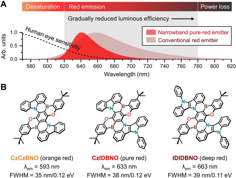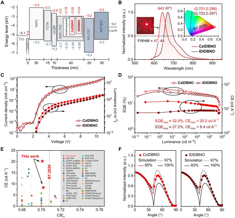 多重共振(MR)化合物因其在宽色域显示中的潜在应用而受到广泛关注。然而,开发同时具有高效率和饱和发射色的红色MR发射体仍然具有挑战性。深圳大学杨楚罗教授团队通过同时调节双硼嵌入MR骨架的π共轭和电子给体强度,同时保持窄带特性,来实现红色区域的光谱调节。概念验证材料表现出从橙红到深红的发射,带宽低于0.12电子伏特。基于CzIDBNO的纯红色器件显示出优越的色彩纯度,其CIE坐标为(0.701, 0.298),接近BT.2020标准。结合高光致发光量子产率和强水平偶极取向,CzIDBNO还实现了最大外部量子效率32.5%和20.2 cd A−1的电流效率,超越了之前报道的CIE指数超过0.68的有机发光二极管。