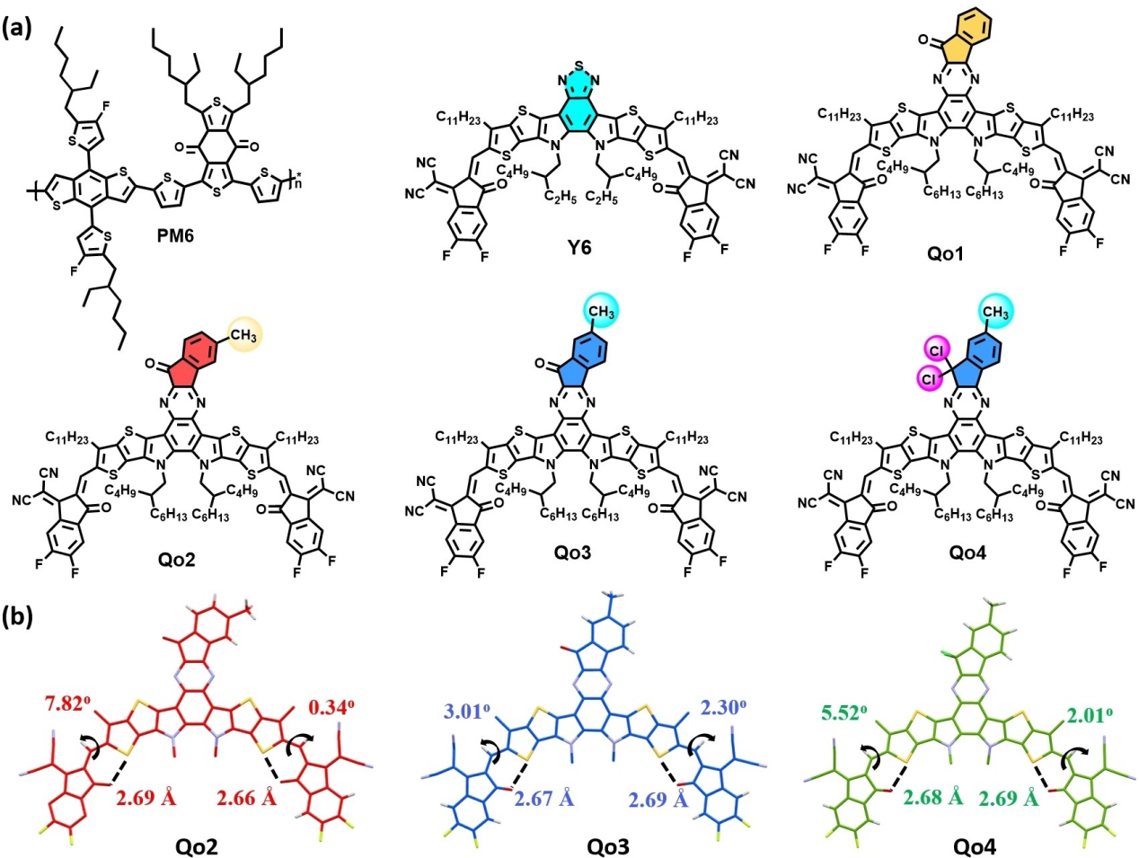 基于之前工作(Angew. Chem. Int. Ed.2023,62, e202304127),本工作为了增强中心核与中心核之间的分子堆积,我们以茚并[1,2-b]喹喔啉-11-酮(Qxo)替换PyQx作为缺电子A1基团,并结合单甲基化的策略合成了三种受体,命名为Qo1、Qo2和Qo3。单晶测试证明Qo2表现出更紧密和更多的分子间氢键的相互作用,具有包括C-H∙∙∙F和C-H∙∙∙O的相互作用。