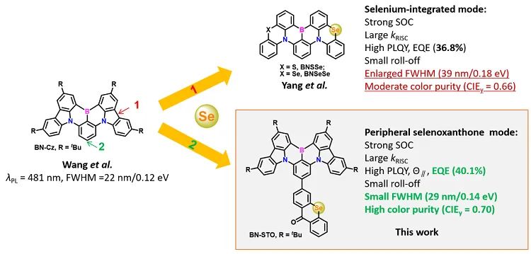 解决效率滚降的关键在于加速反向系间窜跃。深圳大学杨楚罗教授团队近期发展了一种有效策略:在MR-TADF骨架外围以单键连接含重原子硒(Se)的硒杂蒽酮基团,合成了纯绿光材料BN-STO(图1)。该策略巧妙利用了重原子效应增强自旋轨道耦合(spin-orbit coupling, SOC),显著提升了kRISC(达1.2 × 105 s-1,为对比分子BN-XTO的4倍),同时避免了将Se原子直接嵌入MR骨架导致的结构弛豫增大和谱带展宽问题(图2)。