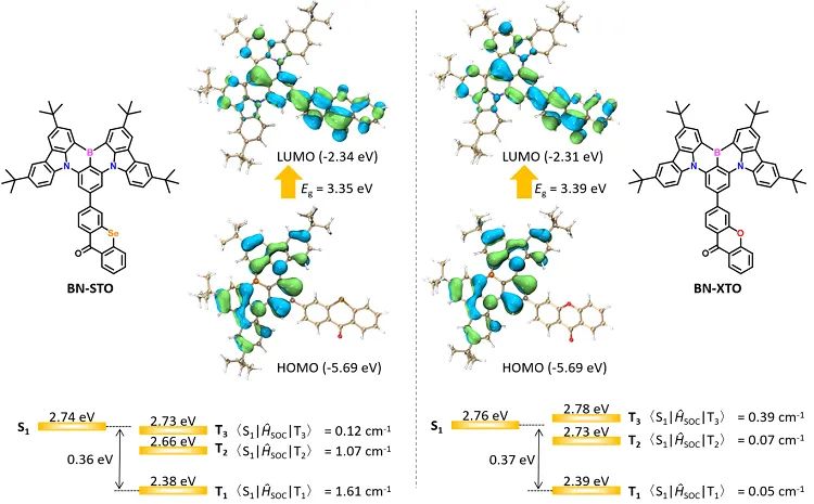 图2. BN-STO和BN-XTO的分子结构及理论计算(显示BN-STO具有更大的SOC矩阵元)