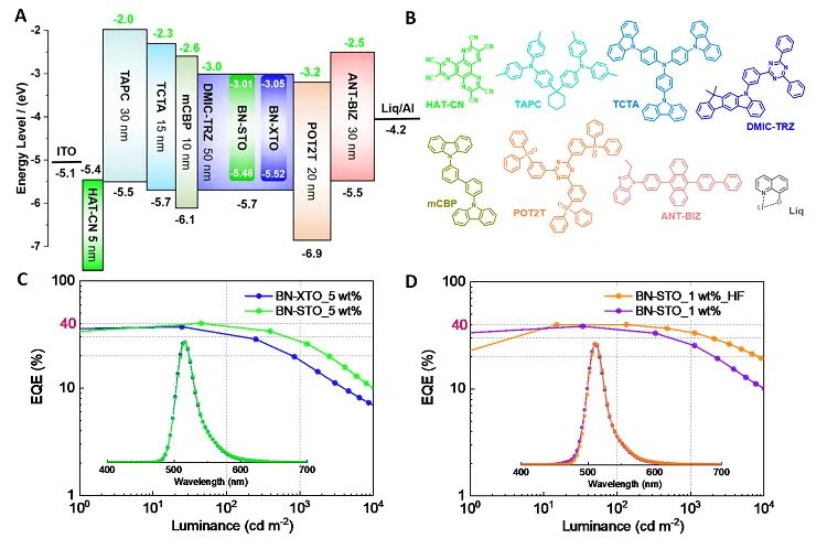 得益于该设计,BN-STO在甲苯溶液中发射波长为506 nm,半峰宽仅为29 nm(0.142 eV),展现出高色纯度。其光致发光量子效率(PLQY)和辐射跃迁速率(kr)也优于BN-XTO。基于BN-STO制备的OLED器件实现了高达40.1%的外量子效率(EQE),在1000 cd m⁻⟡亮度下仍保持近30%的EQE,其CIE色坐标(0.19, 0.70)非常接近NTSC纯绿光标准(0.21, 0.71)。进一步采用敏化剂制备的超荧光器件,在1000 cd·m-2下EQE高达34.0%,为目前绿光MR-TADF-OLED的最高水平(图3)。相比之下,BN-XTO器件的最大EQE更低且滚降严重。