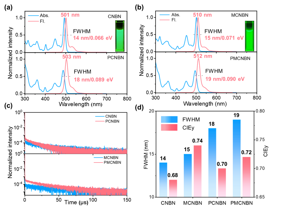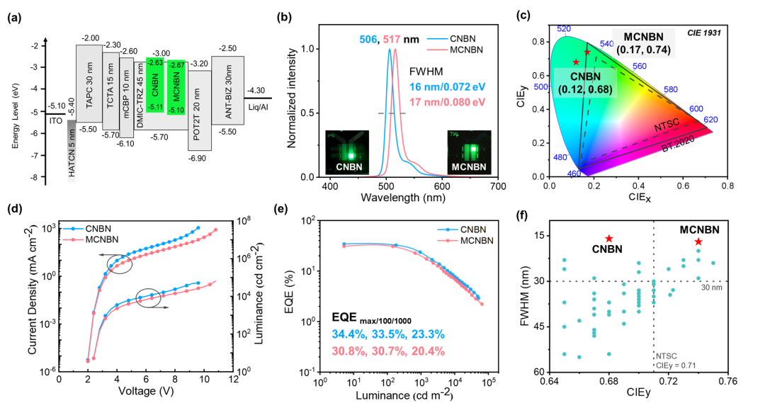 近日,深圳大学杨楚罗教授与胡宇轩助理教授团队报道了一种协同氰基修饰与共轭拓展策略,成功开发出超窄光谱纯绿光OLEDs。基于此策略设计的MR-TADF分子CNBN和MCNBN,不仅具有超窄FWHM(分别为14 nm/0.066 eV和15 nm/0.071 eV),同时兼具接近100%的荧光量子产率(PLQY)和理想水平偶极取向(Θ//)。相应OLED器件展现出目前绿光MR-TADF材料中最窄的EL光谱FWHM(CNBN:16 nm/0.072 eV;MCNBN:17 nm/0.080 eV),最大外量子效率(EQEmax)均超过30%。尤为突出的是,基于MCNBN的器件实现了接近BT.2020绿光标准的理想CIE坐标(0.17, 0.74)。