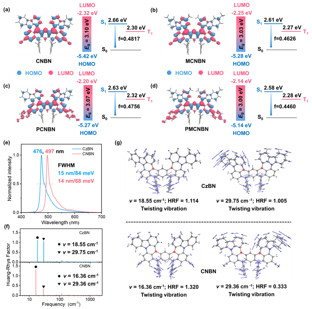 Franck-Condon光谱模拟显示,相较于母核分子CzBN(峰值476 nm, FWHM 15 nm/0.084 eV),氰基修饰的CNBN发射显著红移(峰值497 nm)且FWHM减小至14 nm/0.068 eV。分子振动分析(MOMAP)进一步揭示,CNBN在低频扭曲振动模式上的黄-里斯因子(HRFs)更弱,表明其S1与S0态间振动耦合较弱,是FWHM减小的关键。