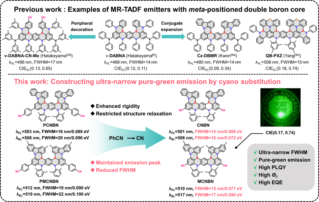 标题:Cyano-Modified Multi-Resonance Thermally Activated Delayed Fluorescent Emitters Towards Pure-Green OLEDs with a CIEy Value of 0.74