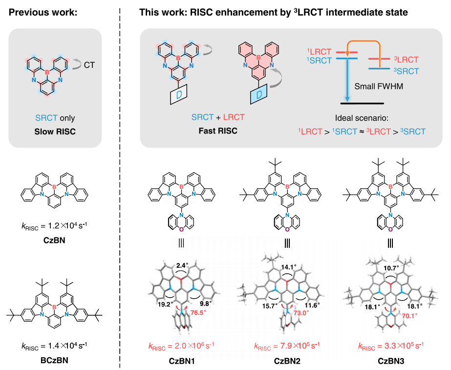 针对以上关键问题,深圳大学杨楚罗教授团队率先提出将硫、硒元素嵌入刚性多重共振骨架中,利用重原子效应增强单/三重激发态轨道之间的自旋轨道耦合(SOC),显著提升kRISC,从而获得兼具高发光效率和较小效率滚降的电致发光材料与器件(Nat. Photonics, 2022, 16, 803)。尽管如此,重原子较大的原子半径不可避免地导致明显的基态与激发态结构弛豫,从而部分牺牲材料的色纯度。有鉴于此,该团队根据传统给受体(D-A)型TADF材料设计思路,提出了一种电荷转移激发态调控的分子设计策略,其核心思想在于:将合适的电子给体单元与硼氮稠环骨架中的硼原子对位正交连接,在保证最低单重激发态(S1)SRCT特性的前提下,合理引入长程电荷转移三重态(3LRCT)促进反向系间窜越过程,从而实现兼具窄半峰宽、高效率和快速kRISC的电致发光材料。