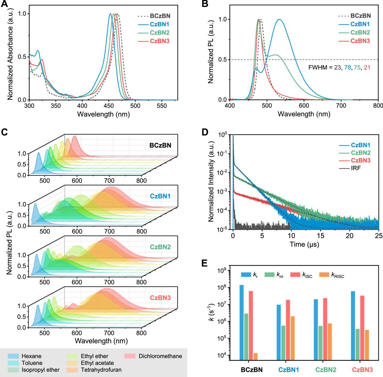 图2:(A, B)甲苯溶液中的吸收和发射光谱;(C)不同溶剂中的发射光谱;(D, E)甲苯溶液中的瞬态发光衰减曲线及动力学速率常数