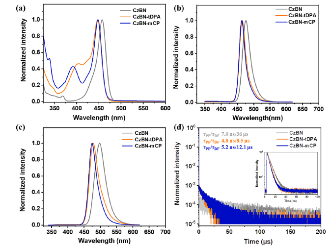 图2. CzBN-tDPA和CzBN-mCP的光物理性质。