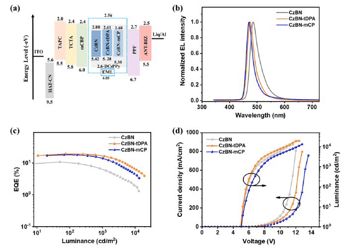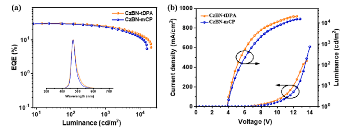 图3. CzBN-tDPA和CzBN-mCP的器件性能。