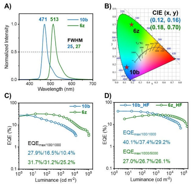光谱研究发现,所合成的化合物均表现出小的Stokes位移和窄的发射光谱,发射光谱可以在深蓝光到橙红光进行调谐。以所合成的化合物6z和10b为例,它们分别为纯绿光和纯蓝光的发射。基于6z和10b为发光层客体材料制备的蒸镀型电致发光器件的发射光谱峰值分别为513 nm和471 nm,对应的半峰宽为27 nm和25 nm,CIE坐标为(0.18, 0.70)和(0.12, 0.16)。得益于它们理想的荧光量子产率(> 98%)和优异的TADF性能,相应器件外量子效率高达31.7%。此外,基于它们的超荧光OLED器件,获得了高达40.1%的外量子效率(1000 cd/m2时29.2%)。