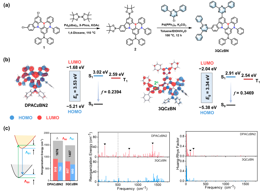 图2. (a)3QCzBN的合成路线。(b)3QCzBN和DPACzBN2的理论计算结果