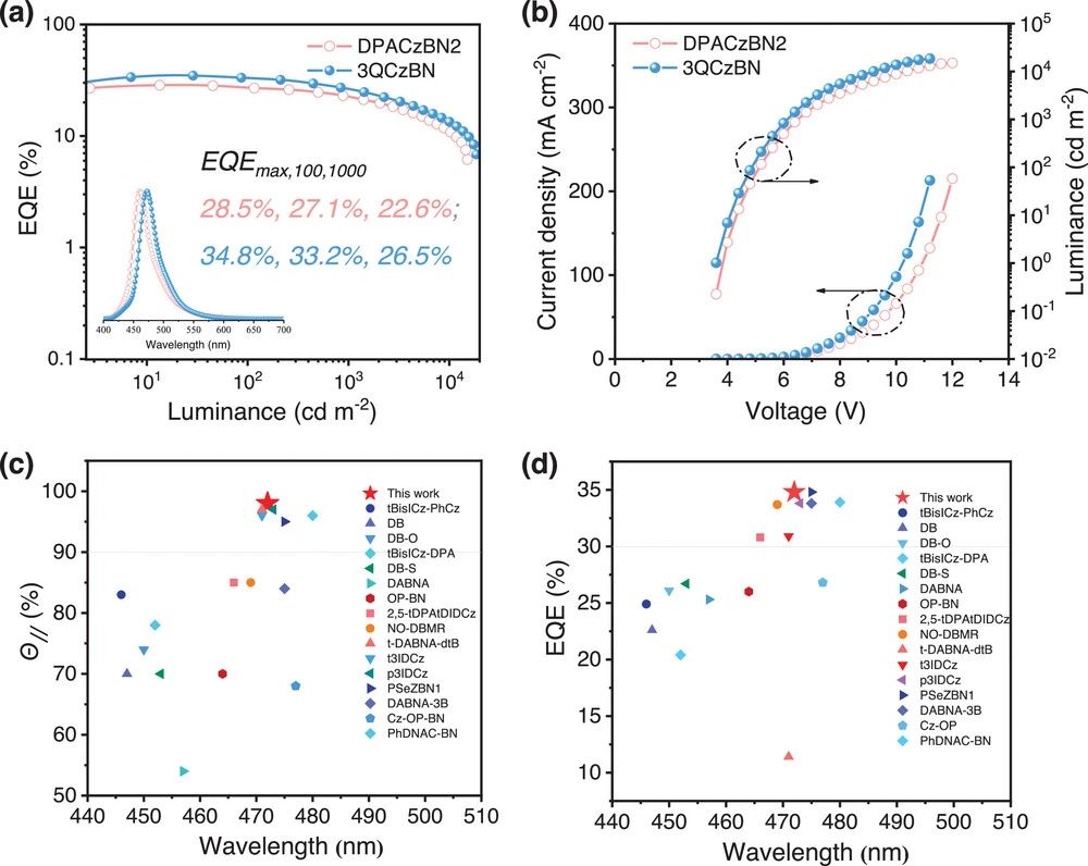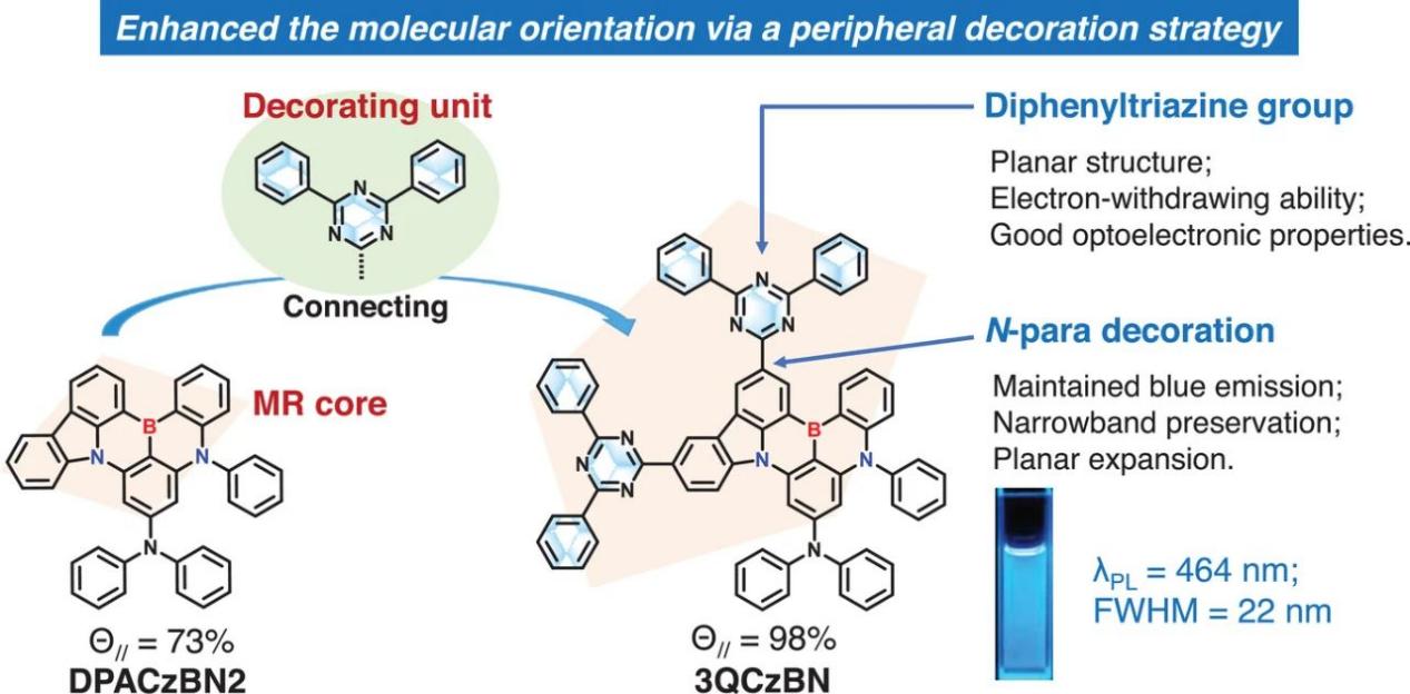 针对上述问题,深圳大学杨楚罗团队报道了基于外围修饰拓展分子平面,以提升MR-TADF材料水平取向构建高性能窄光谱蓝色OLED器件的策略。基于该策略设计的MR-TADF分子3QCzBN不仅具有窄的半峰宽(FWHM = 22 nm),而且兼具优异的Θ//(98%)和接近100%的荧光量子产率(PLQY)。得益于优异的光物理性质,相应的电致发光(EL)器件实现了34.8%的EQEmax,且表现出较低的效率滚降。