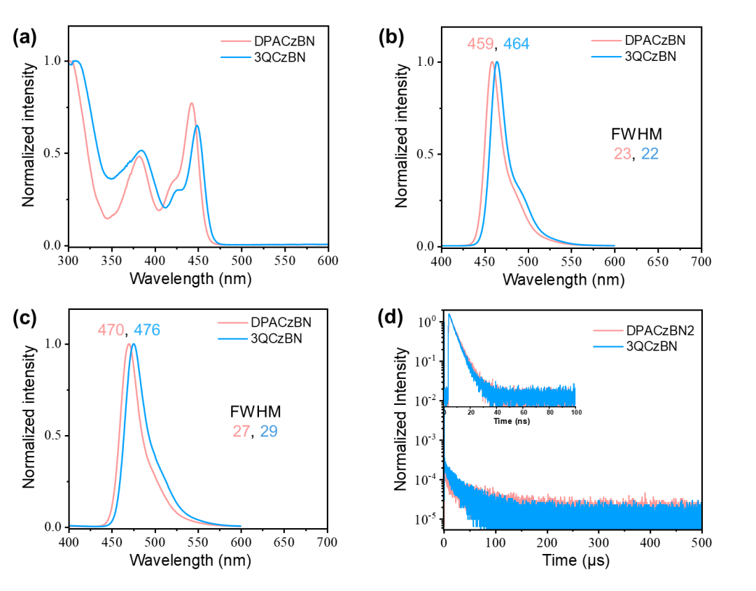 光谱研究如图3所示,两种分子都展现出窄谱带蓝光发射,峰值/FWHM值分别为DPACzBN2的459/23 nm和3QCzBN的464/22 nm,结果与计算模拟非常吻合。在2,6-DCzPPy薄膜中的峰值/FWHM值分别为470/27 nm和476/29 nm(图3c)。重要的是,两种材料在掺杂薄膜中展现出极好的PLQY值,DPACzBN2为92%,3QCzBN为97%。如图3d瞬态光致发光(TRPL)光谱所示,拟合得到DPACzBN2的τPF/τDF寿命分别为5.4 ns/45.5 μs,3QCzBN的分别为4.9 ns /26.0μs。基于TRPL数据和PLQY,计算了光物理过程中的关键动力学常数。3QCzBN显示出更快的单重态辐射衰减(kr,S)和反向隙间窜越(RISC)速率常数,分别为1.36×108 s-1和5.57×104 s-1。相比之下,DPACzBN2的相应值仅为1.315×108 s-1和3.23×104 s-1,表明3QCzBN具有更强的TADF特性。