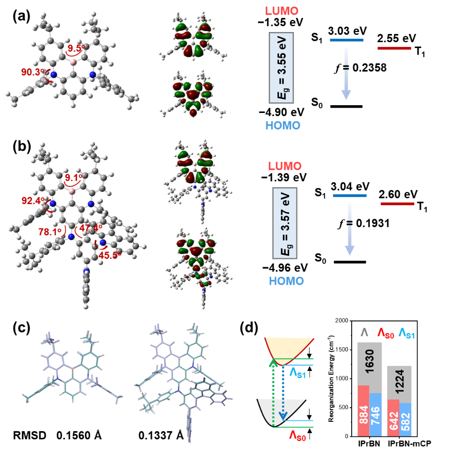 图2. (a) IPrBN和 (b) IPrBN-mCP的前沿分子轨道分布和能级。(c) IPrBN和IPrBN-mCP的RMSD值和 (d) 重组能。