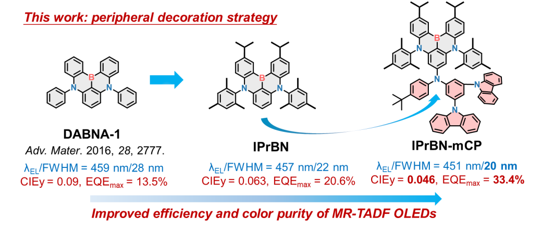 近日,深圳大学杨楚罗团队黄忠衍助理教授报道了基于外围修饰构建高性能窄光谱蓝色OLED发光材料的策略。基于该策略设计的MR-TADF材料IPrBN-mCP在甲苯溶液中表现出452 nm的深蓝光发射,半峰宽仅为19 nm,CIEy达到0.047。相应的电致发光(EL)器件在10 wt%的高掺杂浓度下实现了高达33.4%的最大外量子效率(EQEmax),且CIEy达到0.046,满足BT.2020的要求。