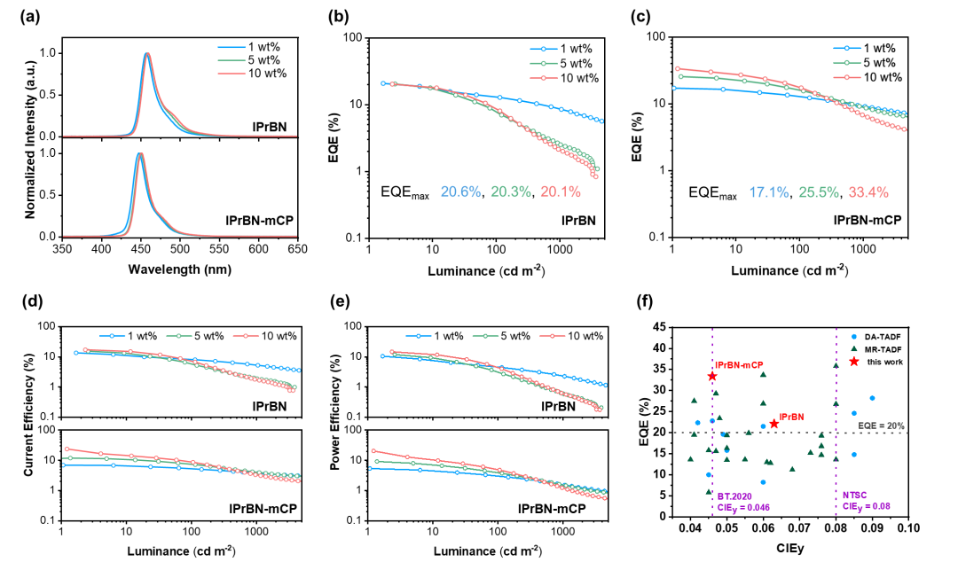 图4. IPrBN和IPrBN-mCP的器件性能。(a)电致发光光谱。(b) IPrBN和(c) IPrBN-mCP的器件外量子效率(EQE)与亮度曲线。(d)器件的电流效率和(e)功率效率随亮度变化曲线。(f)总结器件CIEy值小于0.1的已报道TADF材料。