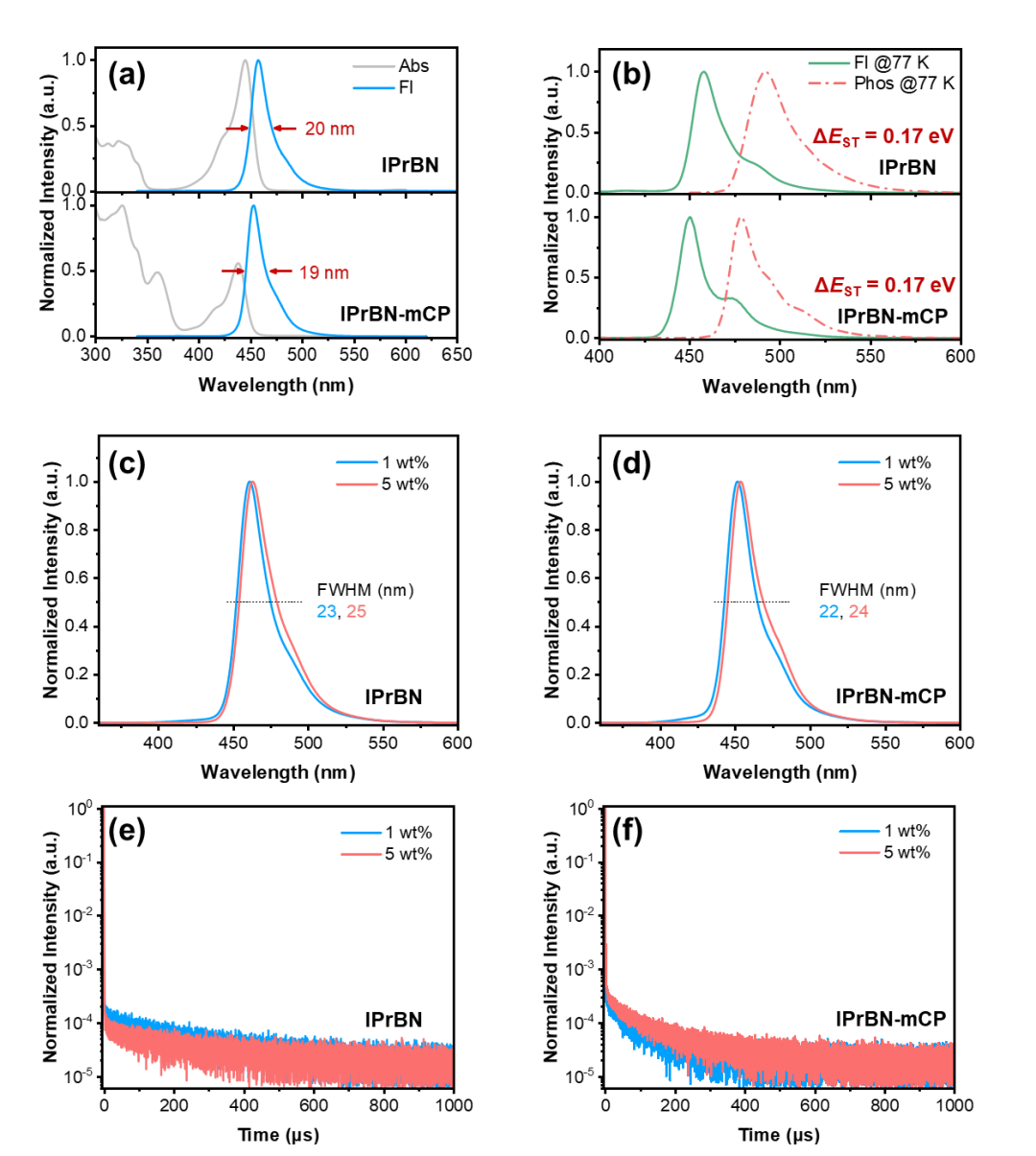 图3. IPrBN和IPrBN-mCP的光物理性质。甲苯溶液 (10-5 M) 中 (a) 紫外可见吸收和稳态荧光 (300 K)光谱。(b) 77 K荧光和磷光光谱。掺杂膜中 (c) IPrBN和 (d) IPrBN-mCP的荧光光谱。在氩气气氛下 (e) IPrBN和 (f) IPrBN-mCP的瞬态光致发光衰减曲线。