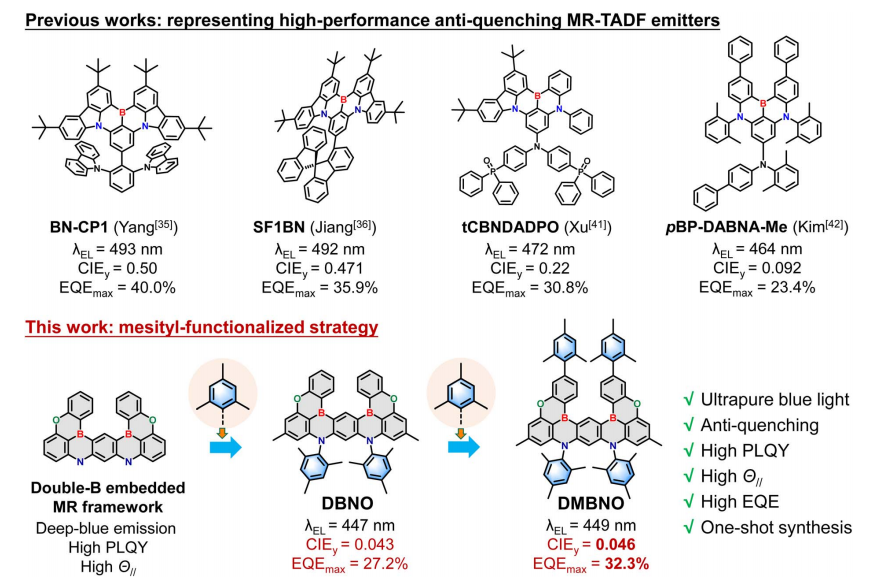 标题:A mesityl-functionalized double-boron–nitrogen–oxygen-embedded multi-resonance framework achieves anti-quenching narrowband deep-blue electroluminescence with EQE over 30% and CIEy of 0.046