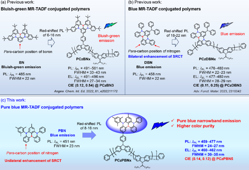 这项工作为开发具有高色纯度蓝光发射的MR-TADF共轭聚合物提供了新的设计思路,对于推动窄带蓝光OLED的发展具有重要意义。