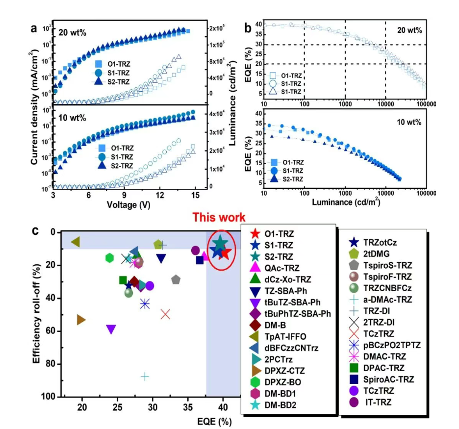 标题:Nonplanar structure accelerates reverse intersystem crossing of TADF emitters: nearly 40% EQE and relieved efficiency roll off