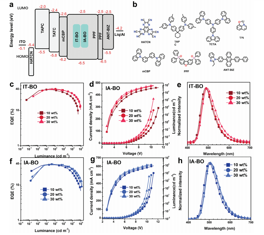 该工作开发了IA-BO以及IT-BO 两个 TADF 分子,它们具有混合短程电荷转移(SRCT)和长程电荷转移(LRCT)特性。它保持了LRCT主导的光致发光性质和短延迟寿命,同时引入的SRCT加快了辐射衰变。因此,这些发光材料展现出卓越的电致发光性能,最大外量子效率(EQE)超过40%,同时具有超高亮度和较低的效率衰减。该工作提出了一种创新方法,通过混合SRCT和LRCT来开发实用的TADF材料。