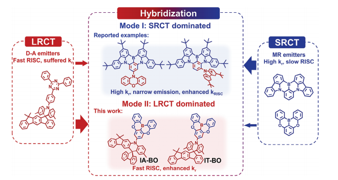 这项研究论文设计了两种基于硼氮(BO)多共振受体的TADF分子 IT-BO 和 IA-BO,通过短程电荷转移(SRCT)与长程电荷转移(LRCT)的协同作用,平衡辐射衰减速率Kr与反向系间窜越速率KRISC,优化激子动力学。
