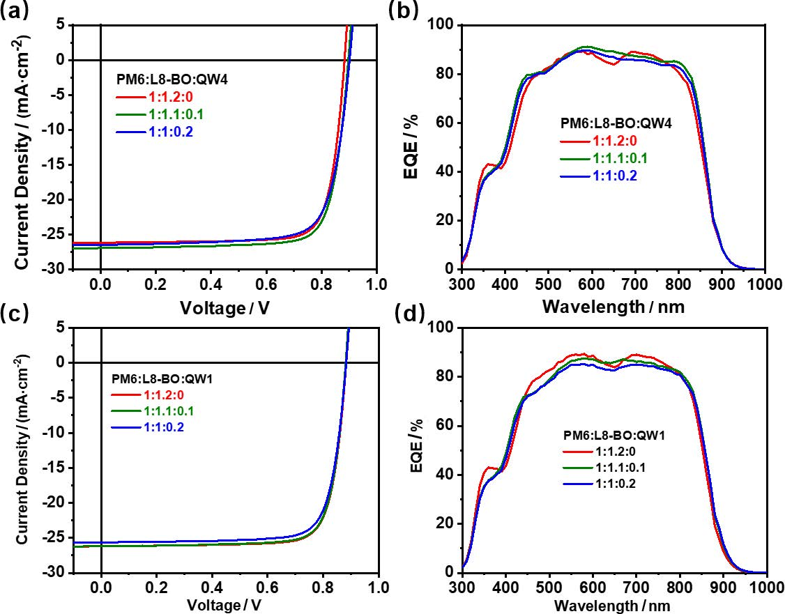 基于PM6:QW1的器件实现了15.63%的更高效率,优于基于QW2(14.25%)、QW3(13.21%)和QW4(15.03%)的器件。此外,基于QW4的器件产生了0.933 V的最高开路电压,而PM6:L8-BO:QW4三元器件实现了19.03%的功率转换效率(PCE)。总体而言,我们的研究表明,调节缺电子中心单元是提高所得A-DA1D-A型SMAs光伏性能的有效策略。