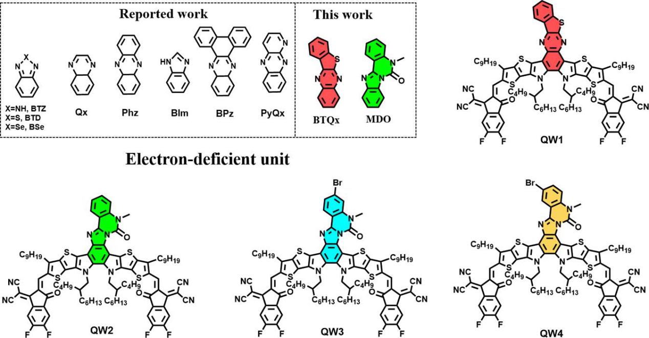 在A-DA1D-A型小分子受体(SMAs)中,精细调节缺电子单元对于开发高效有机太阳能电池(OSCs)用SMAs起着至关重要的作用。本研究开发了一种基于苯并[4,5]噻吩并[2,3-b]喹喔啉的SMA,命名为QW1,以及三种基于1-甲基吲哚啉-2,3-二酮的SMAs,分别命名为QW2、QW3和QW4。与QW2相比,QW1由于苯并噻吩并喹喔啉(BTQx)相较于1-甲基吲哚啉-2,3-二酮(MDO)具有更强的吸电子能力,因此表现出略微蓝移的吸收光谱和更低的LUMO能级。另一方面,与QW2相比,QW3和QW4中溴原子的引入导致了吸收光谱的蓝移和LUMO能级的降低。密度泛函理论分析表明,QW1展现出最佳的分子平面性,这赋予了QW1更大的电子迁移率和更紧密的分子堆积。