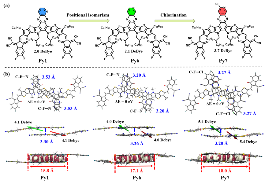杨楚罗团队开发了一系列基于吡啶并[2,3-b]喹喔啉的SMAs(Py1-Py5),其中Py2实现了最高的器件效率17.73%,这要归功于更好的电荷传输和更有利的形貌。然而,这项研究忽略了一个关键点,即基于氯化Py2的器件的VOC明显高于未氯化的Py1器件(VOC为0.736 V)。在本文中,为了进一步研究Py系列受体的光伏电位并确定氯化后VOC的增强是否在整个体系中一致,我们设计了Py6,它是Py1的异构体,其吡啶上的氮原子的位置进行了改变,然后对Py6 进行氯化得到Py7。JSC、FF和VOC的共同增强使基于Py7的器件的PCE达到18.51%。此外,通过给体和受体的相互稀释策略,(D18:1wt%Py7)/(Py7:1wt%D18)器件的PCE达到了的19.60%。我们的工作不仅凸显了Py系列受体的巨大光伏潜力,而且还表明氯化可以改善分子堆积,同时减少非辐射能量损失。我们的研究为高效SMAs的分子设计提供了重要的指导思路。