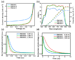 杨楚罗设计了三种新的 SMAs:NA9、NA10 和 NA11,它们都具有相同的骨架,并使用苯并[b]吩嗪 (BPA) 作为缺电子A1单元。与非卤化的 NA9不同,NA10和NA11的BPA单元上分别有两个氯原子和两个溴原子。与 NA9相比,NA10和NA11 表现出降低的能级、增强的分子堆积和改善的晶体有序性。因此,NA10和NA11表现出优异的性能,氯化的NA10的PCE达到15.65%,溴化的NA11的PCE明显更高,达到 16.64%。相比之下,NA9的PCE相对较低,为11.66%,同时短路电流密度 (JSC) 降低至20.68 mA cm-2,填充因子 (FF) 为61.84%。这个发现强调外围卤化策略在A-DA1D-A型SMAs设计中的重要性。